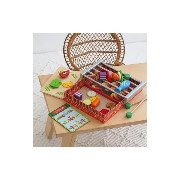 Ce petit atelier dinette se compose d’une grille, d’une planche, de 3 brochettes et de pleins d’aliments pour les garnir : champignons, poivrons, tomates, saucisse, aubergine, poisson, fromage…