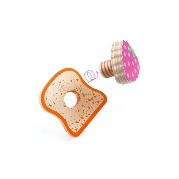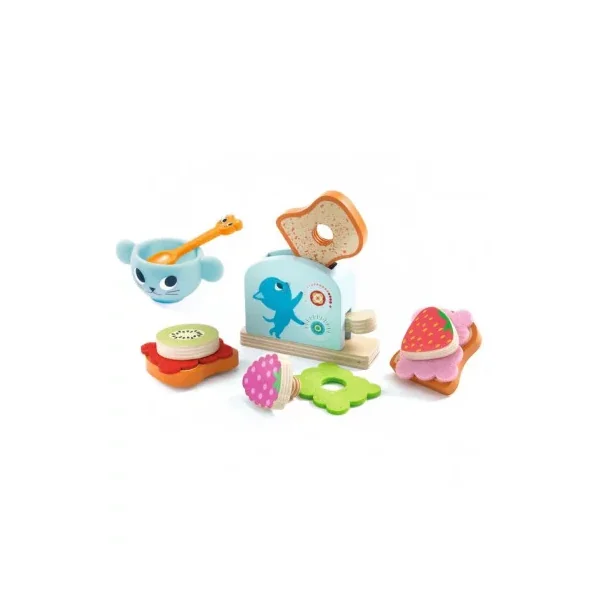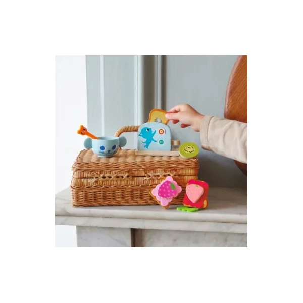Une première dinette grâce à laquelle l’enfant crée de savoureuses tartines grâce aux différents ingrédients (de multiples combinaisons possibles), il touille le café dans la tasse, met les tartines dans le grille-pain… La manipulation des pièces promet un riche apprentissage de la dextérité pour visser et actionner le toaster.