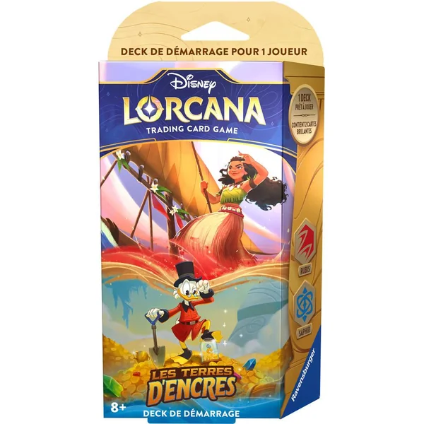 Starter deck RUBIS SAPHIR – Les Terres d’Encres poursuit l’histoire des Illumineuses et Illumineurs mystérieusement transportés au royaume de Lorcana (Premier Chapitre). Après avoir accidentellement déclenché une inondation d’encres (L’ascension des Floodborn) qui a dispersé de précieux éclats de Lore dans tout le royaume, les Illumineuses et Illumineurs sont maintenant chargés de retrouver ces éclats de Lore et de les ramener dans le Hall de Lorcana. Leur quête pourrait être plus périlleuse qu’ils ne le pensent…