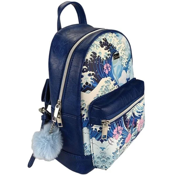 Sac à dos fashion bleu représentant Stitch surfant sur une énorme vague accomapgné de fleurs d’hibiscus. On se croirait à Hawaii.
