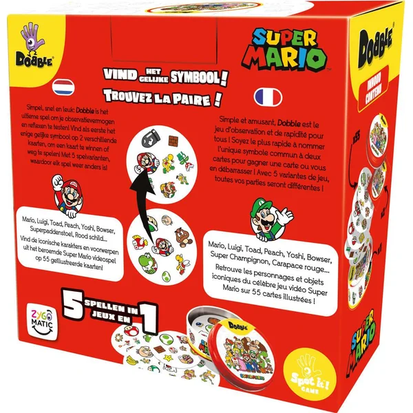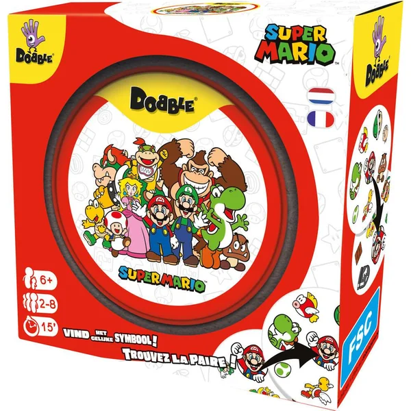 Dobble au Royaume Champignon ! Retrouvez tous les personnages et symboles de la saga Nitendo Super Mario : Mario, Luigi, la Princesse Peach, Browser, Yoshi, etc. Dobble est un jeu testant votre rapidité et votre sens de l’observation. Le but est simple : être le premier à trouver le dessin identique entre deux cartes. De 2 à 8 joueurs. 15 minutes.