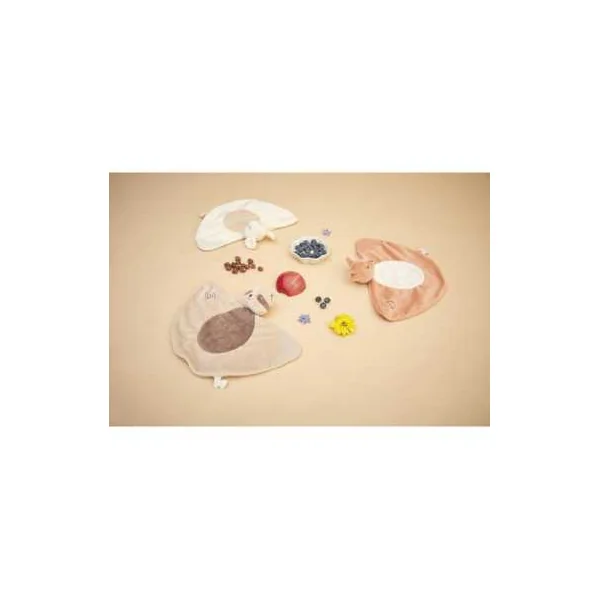 Matières : micro-velours recyclé et silicone. Rembourrage et polyester recyclé. Ce doudou est composé d’au moins 77% de matières et rembourrage recyclés.