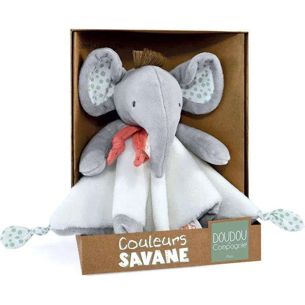 Avec les Doudous et accessoires COULEURS SAVANE, bébé saura facilement apprivoiser ces sublimes animaux pour jouer, rêver et s’éveiller au monde qui l’entoure ! Mon Doudou Eléphant, un grand Doudou pour accomplir de grands rêves ! Ce Doudou plat est composé de deux tissus, l’un ultra doux en velours de coton et l’autre en coton imprimé pour un toucher différent à apprécier en fonction de son humeur. Orné de 2 nouettes en coton, et 2 nouettes en coton lange à manipuler par les petites mains de bébé. Cette diversité de matières permettra à bébé d’apprécier des moments de calme, d’apaisement et d’endormissement. Ce produit bénéficie de LA GARANTIE DOUDOU. Grâce à son numéro unique, Doudou perdu est vite retrouvé ! Enregistrez votre Doudou et découvrez toutes les garanties sur le site doudouetcompagnie.com.