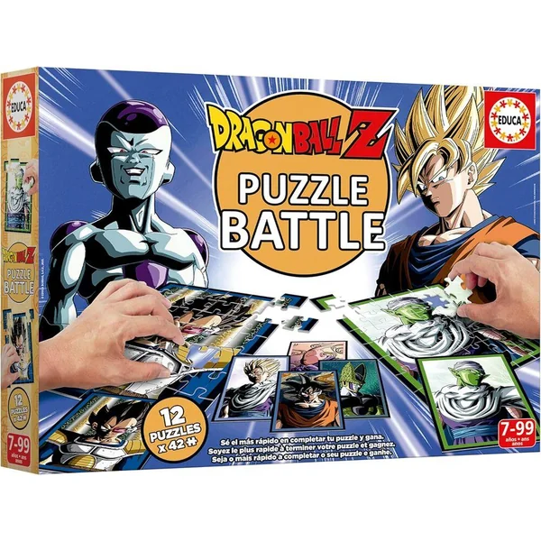 ÊTES-VOUS PRÊT À TESTER VOS COMPÉTENCES? Bienvenue dans Puzzle Battle Dragon Ball Z, le jeu rapide qui mettra à l’épreuve votre rapidité, vos compétences d’observation et votre capacité à résoudre des puzzles! Affrontez vos amis et votre famille pour voir qui peut compléter son puzzle en premier et remporter la victoire! Contient 12 puzzles de 42 pièces (504 pièces), 12 cartes d´images, instructions.