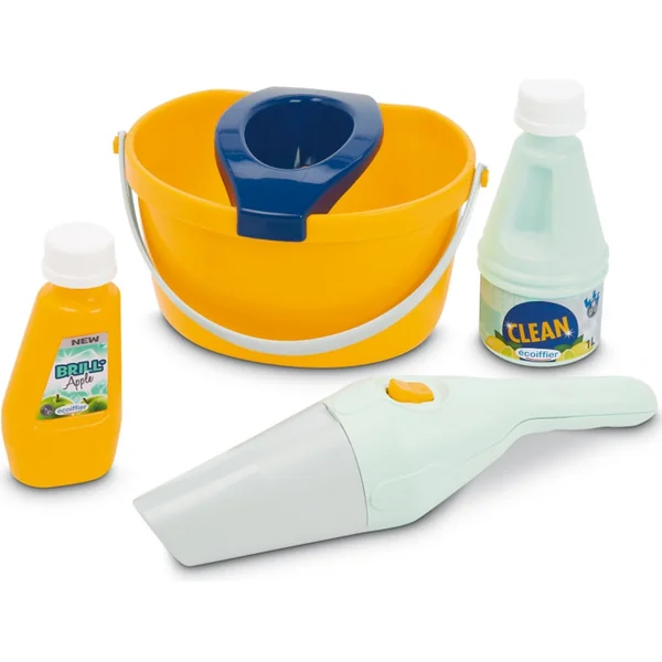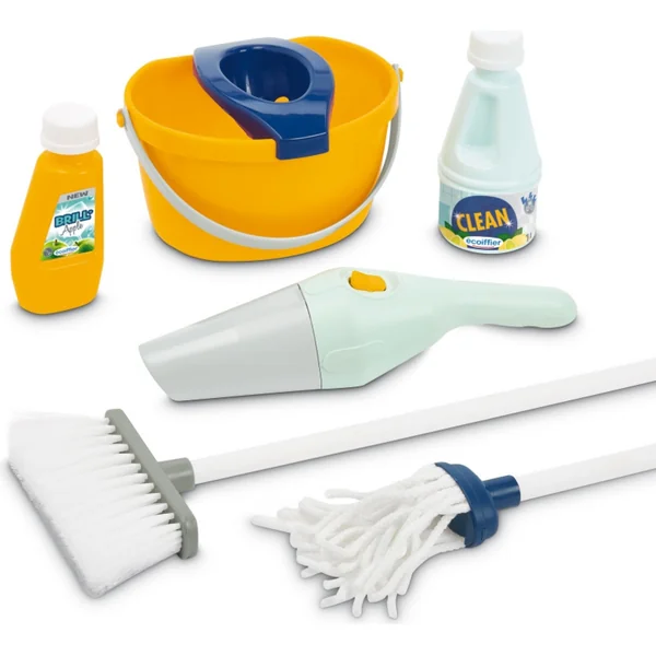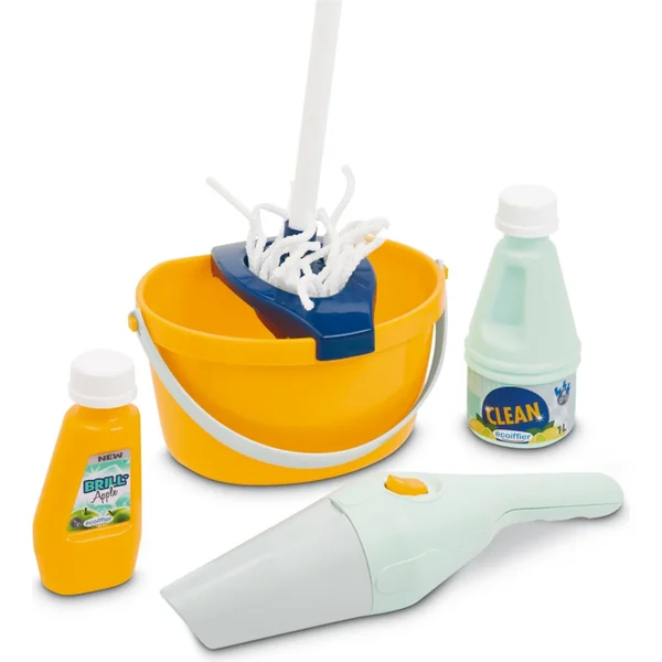 Le set comprend : une serpillière, une grande brosse, un aspirateur, un seau avec un panier spécial pour essorer l’eau de la serpillière, 2 produits de nettoyage. un chariot solidement construit avec deux roues pour un rangement facile des outils