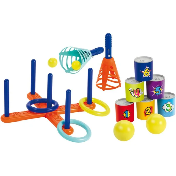Ambiance kermesse pour ce pack contenant un chamboule tout de 6 boites de conserves et 2 balles, un jeu croix avec 3 anneaux et un jeu de 2 lance-balles avec 2 balles.