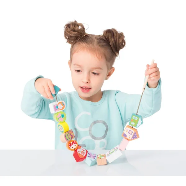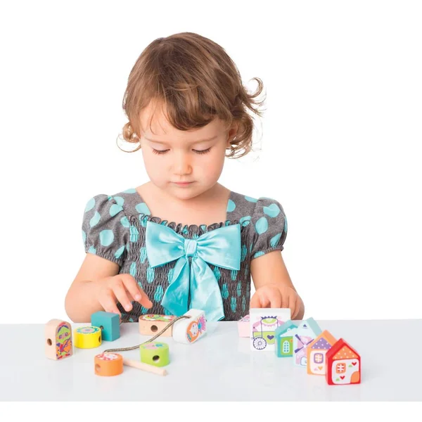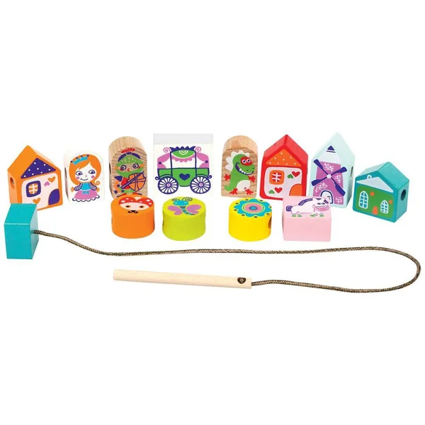 12 blocs en bois à enfiler sur une cordelette à l’aide d’une longue aiguille en bois. Les blocs sont ornés de divers personnages de contes de fées tels que princesse, chevalier, dragon, carrosse… 8 cartes fournies pour indiquer à l’enfant différentes séquences pour enfiler les éléments. Les blocs peuvent aussi être utiliser séparément. En bois : hêtre et sycomore. Permet de se familiariser avec les formes et de découvrir les couleurs. Développe la motricité fine et le raisonnement logique. Livré en boîte couleur. Produit en bois certifié.