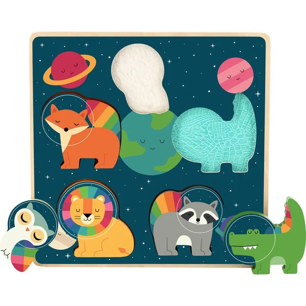 Vilac a conçu ce magnifique encastrement aux couleurs arc-en-ciel peuplé d’animaux en apesanteur dans l’espace, illustré avec poésie par l’artiste Andy Westface. Sous chaque animal se cache une texture que l’enfant découvre en soulevant les pièces. Doux, granuleux, rugueux, avec des stries, les textures cachées sous les animaux procurent autant de sensations qui permettent aux petits de développer plus finement le sens du toucher. Chaque animal a une place bien spécifique : les petits développent ainsi leur esprit d’analyse et d’observation ainsi que leur motricité fine pour placer chaque animal dans le bon emplacement.