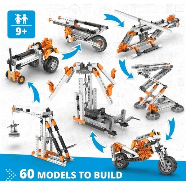 Construisez 60 modèles fonctionnels qui couvrent des thèmes tels que le levier, le coin, la roue et l’essieu, la vis, le plan incliné, la poulie, ainsi que des transmissions et des connexions plus avancées !