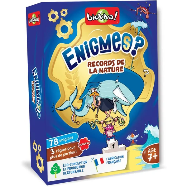 Sois le plus rapide à deviner les records de la nature qui se cachent derrière les 5 indices et fais preuve d’adresse pour gagner encore plus de cartes ! De 2 à 6 joueurs. Durée d’une partie : 20 minutes. Dès 7 ans. Contenu du jeu : 80 énigmes illustrées, 1 plateau de jeu, 1 jeton en bois et 1 règle du jeu. Fabriqué en France et éco-conçu.