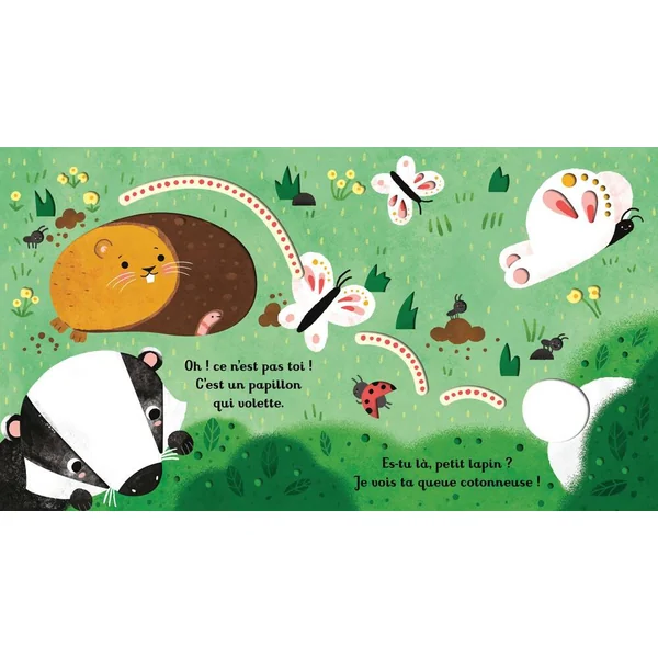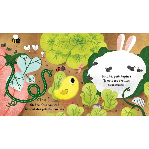 Sur chaque page, une découpe laisse apercevoir le petit lapin qui semble se cacher à la page suivante et … qui n’a plus rien d’un lapin dès qu’on tourne la page. Les très jeunes enfants ne se lasseront pas de scruter les illustrations pour retrouver la trace de ce lapin insaisissable et rencontrer d’autres animaux. Des illustrations pleines de charme, à observer dans le moindre détail. Les grandes découpes nous font voir un lapin alors qu’il s’agit de tout autre chose : effet de surprise garanti !dès 6 mois.