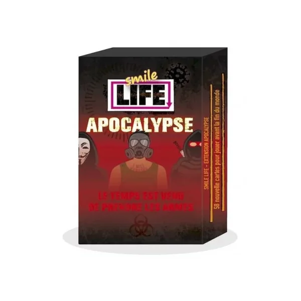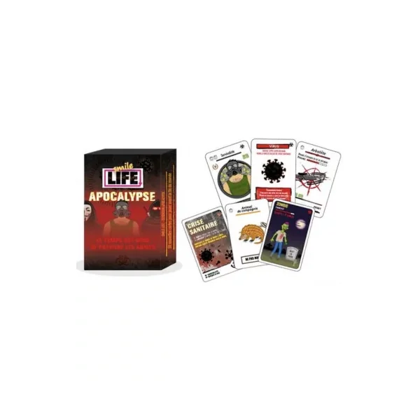 58 nouvelles cartes pour jouer avant la fin du monde! Une nouvelle extension du célèbre jeu Smile Life avec encore plus d’interactions, de surprises… et de fun! L’heure de l’Apocalypse a sonné, la fin est proche… résistez aux crises, armez-vous, combattez, affrontez vos adversaires…. Les nouvelles mécaniques apportent une multitude de possibilités encore inexplorées dans le jeu. Toujours en restant très accessible, avec humour, clins d’œil à la pop culture et second degré.