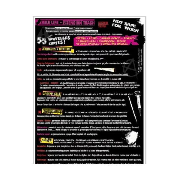 Découvrez l’extension Trash du jeu Smile life, un jeu d’ambiance à partir de 16 ans qui consiste à faire et réussir sa vie. 55 nouvelles cartes pour croquer le vice à pleines dents avec cette extension où tous les coups sont permis… pour le meilleur et surtout pour le pire!