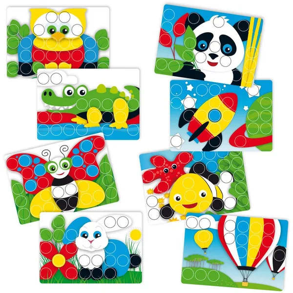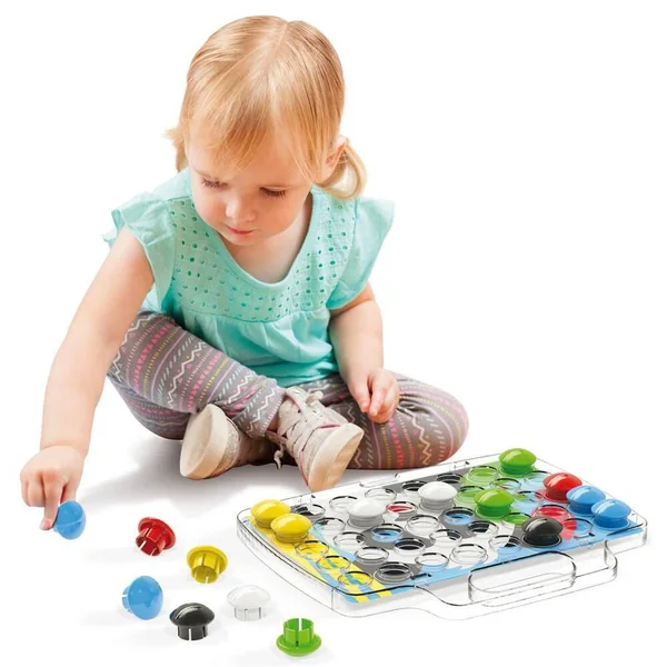 Crée de magnifiques mosaïques en boutons de 6 couleurs différentes. La planche transparente a des trous où les boutons sont insérés. Les boutons sont très faciles à mettre mais restent parfaitement en position. Les cartes avec les images à reproduire sont placées à l’arrière de la grille transparente pour stimuler la perception visuelle. La poignée la rend facile à transporter, mais aussi original et élégant. Jeu éducatif pour s’amuser avec les couleurs. Reproduis les modèles sur le pupitre transparent ! Avec 49 pièces et 8 fiches modèles recto-verso.