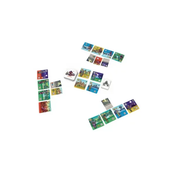 Dans une partie de Faraway, vous jouez 8 cartes devant vous, en une ligne de gauche à droite. Ces cartes représentent les régions que vous visitez lors de votre exploration. Chaque carte vous demande de remplir des conditions pour gagner des points de victoire. En fin de partie, vous réalisez le chemin de retour en comptant vos points dans le sens inverse de pose. Et c’est là tout le sel du jeu. Tout au long de la partie, vos cartes serviront à la fois à vous fixer de nouveaux objectifs et à remplir ceux que vous avez déjà joués. A chaque tour, vous faites votre choix dans votre main de 3. Puis, vous complétez votre main grâce à la rivière de cartes.