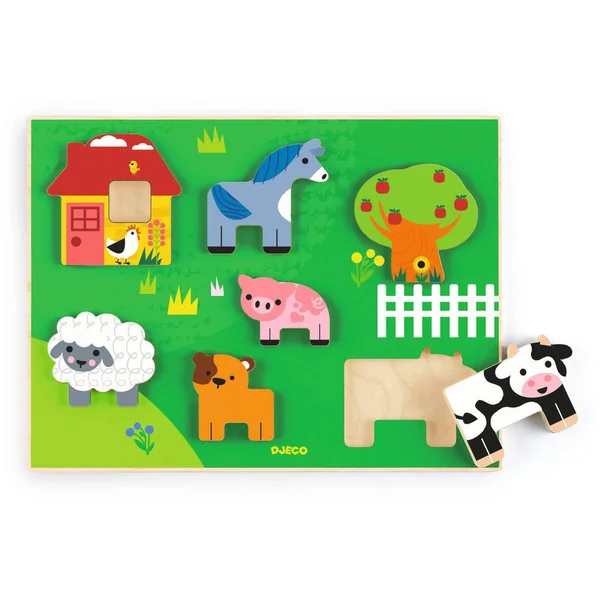 Farm Story est un puzzle en bois sur le thème de la ferme. Les pièces épaisses tiennent debout et permettent à l’enfant de s’amuser avec les animaux et le décor.