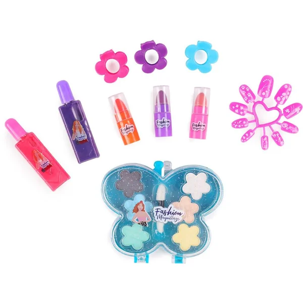 1 boite avec 6 ombres à paupières, 3 rouges à lèvres, 2 vernis à ongles, 10 faux ongles, 3 barrettes à cheveux.