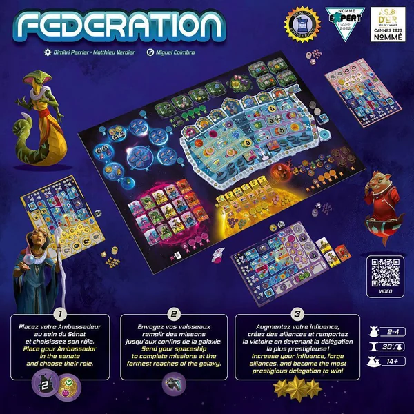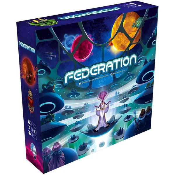 Jeu Expert de type Eurogame. 2 à 4 joueurs. Federation est un jeu de gestion de 2 à 4 joueurs avec une durée calibrée de 30mn par joueur. Dans Federation, notre objectif est d’être la délégation la plus prestigieuse afin d’intégrer la Federation, constituée déjà de 5 planètes fédérées. Pour relever le défi, chaque joueur enverra ses pions Ambassadeur sur des cases actions du Sénat afin de développer son influence auprès des 5 planètes fédérées, de créer des alliances court terme, d’anticiper et de s’adapter aux actions des autres joueurs.