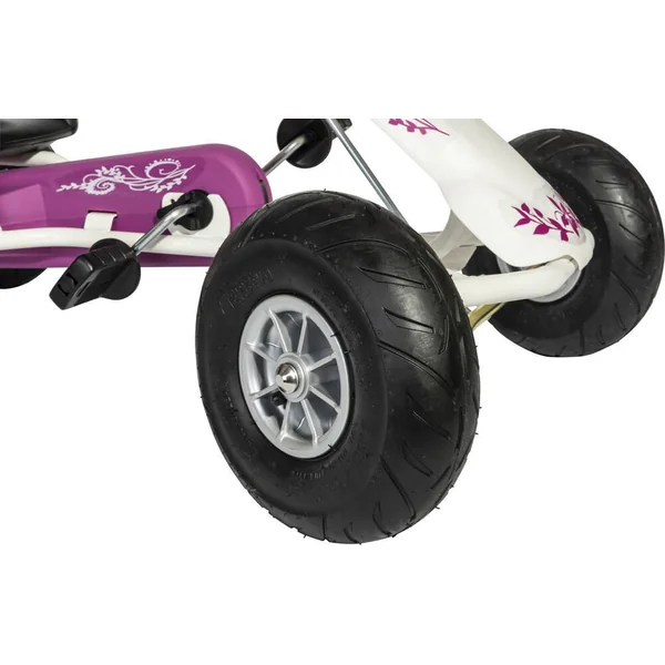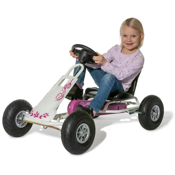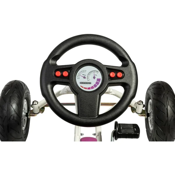 Le kart à pédales Ferbedo GoKart Air Runner, couleur rose. ge : entre 3 et 8 ans. Cadre en acier de haute qualité (blanc). Roue libre Ferbedo – avant et arrière sans changement de vitesse, rayon de braquage optimisé, siège de forme ergonomique et réglable, roues pneumatiques, frein à main inclus. Volant sonore Ferbedo, attelage arrière poids : jusqu’à 50 kg.