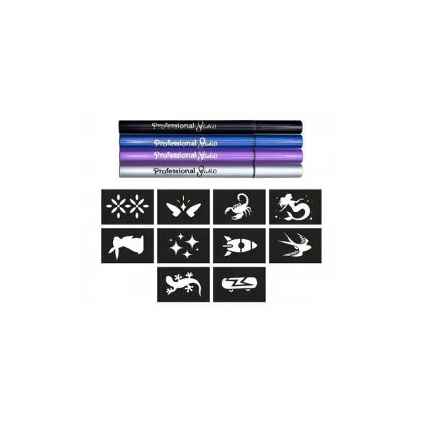 Le coffret contient 4 feutres de tatouage cosmétiques, 10 pochoirs repositionnables et 1 notice illustrée.