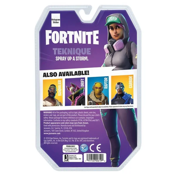 Pack de 1 figurine Solo Mode Série 1 – Graffeuse. Contient : 1 figurine articulée de 10 cm du skin Graffeuse (Teknique en anglais), 1 pioche appelée Rouleau rebelle (Renegade Roller en anglais), 1 matériel de construction et 1 liste du collectionneur. En plastique. Licence : Fortnite.