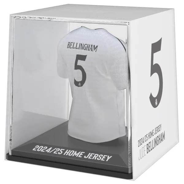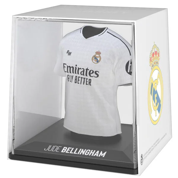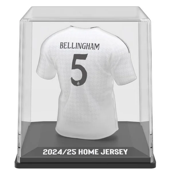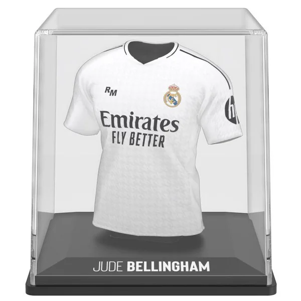 Figurine du maillot du footballeur Jude Bellingham : maillot domicile de l’équipe du Réal de Madrid CF 2024/2025. Hauteur : 9.5 cm.