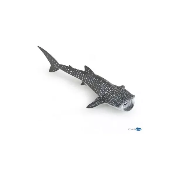 Découvrez la figurine de requin baleine Papo, un animal marin très reconnaissable avec sa peau d’un gris foncé marquée par des taches claires, ainsi que des bandes horizontales et verticales allant du blanc au jaune.