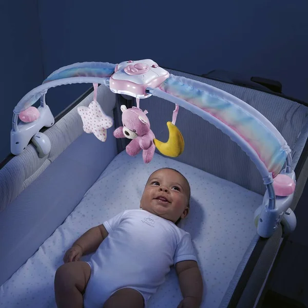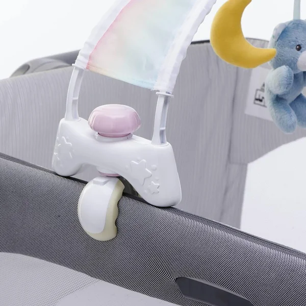 Arche de lit arc-en-ciel avec veilleuse lumineuse amovible et portable. L’arche est également composé de 3 mobiles en peluche. La veilleuse peut être utilisée avec l’arche pour les premiers mois de l’enfant et seule par la suite.