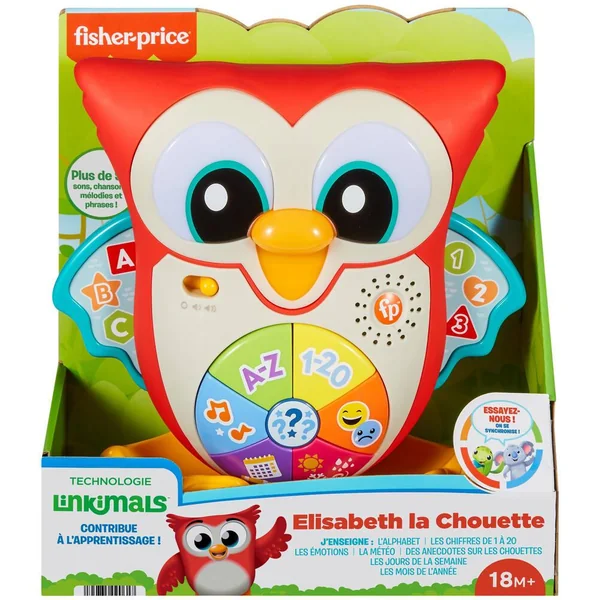Offrez des moments de jeu super chouettes avec Élisabeth la Chouette, qui fait partie de la gamme Linkimals de Fisher-Price. Lorsque l’enfant appuie sur les boutons sur le ventre de la chouette et la berce, cette amie expressive s’illumine de couleurs vives et active plus de 90 chansons, sons et phrases pour lui apprendre à compter de 1 à 20 et lui faire découvrir l’alphabet, la météo, les émotions et plus encore. Placez Élisabeth la Chouette à proximité d’un ou de plusieurs autres Linkimals pour qu’ils se parlent, chantent, s’illuminent et jouent ensemble !