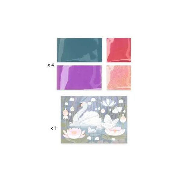 Ce coffret comprend 1 planche à peindre, 1 palette de 6 pastilles de gouaches et son pinceau, 2 cartes à gratter avec effet métallisé + 1 stylet en bois, 3 planches de pièces en carton prédécoupées à détacher puis assembler, 1 planche de travail avec zones autocollantes + 4 feuilles métallisées de couleurs différentes, 1 panneau triptyque à compléter, 10 tampons mousse, 1 encreur violet, 2 planches de travail, 2 planches imprimées prédécoupées d’éléments de papier à détacher puis coller, 1 planche de stickers mousse double face et 1 livret d’explications pas à pas en couleurs.
