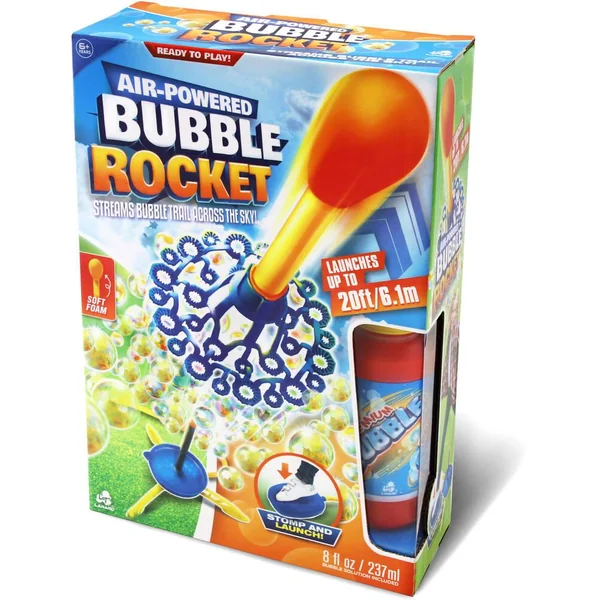 Lance des centaines de bulles dans le ciel ! Lancement de la fusée jusqu’à 6 mètres ! Solution à bulles de 237 ml incluse (8 oz). Facile à utiliser : il suffit de d’utiliser la pompe à pied, aucune pile requise. Contient : 1 fusée avec un embout en mousse, 1 lanceur avec un plateau pour solution à bulles et 1 flacon de solution à bulles. Instructions imprimées sur la boîte. Dimensions de la fusée assemblée sur sa base : 36 x 36 x 33 cm.
