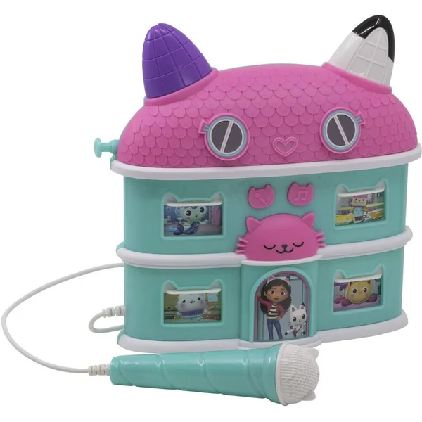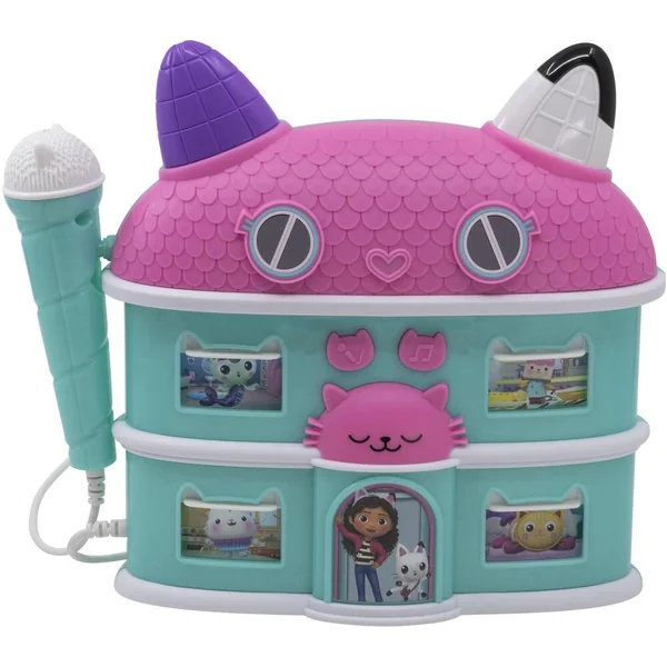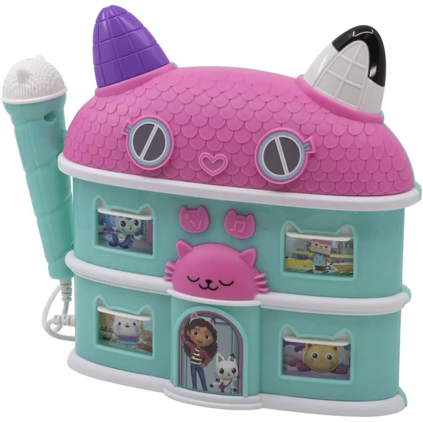 Gabby et la maison magique. Karaoké avec microphone. Nombreux effets sonores. Effets lumineux. Support de rangement du micro. Inclus le thème de Gabby’s Dollhouse. Notice incluse. 3 piles LR03 non fournies. Le Try Me et les fonctions interactives sont en anglais.