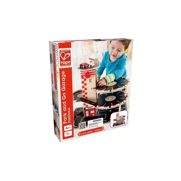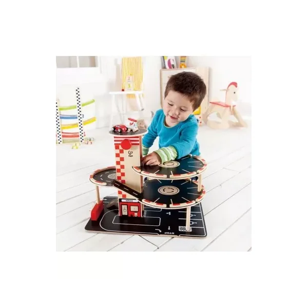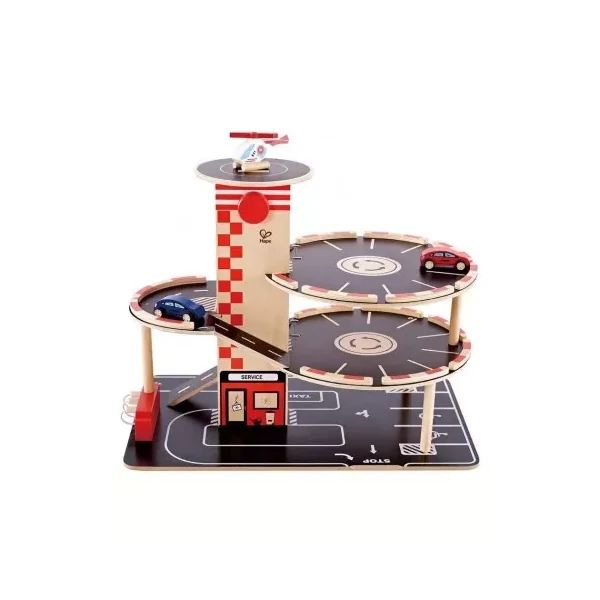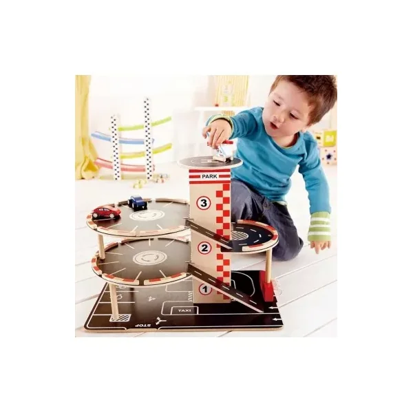 Découvrez le garage multi niveaux de Hape, un superbe garage en bois sur 4 niveaux avec 2 voitures et un hélicoptère.