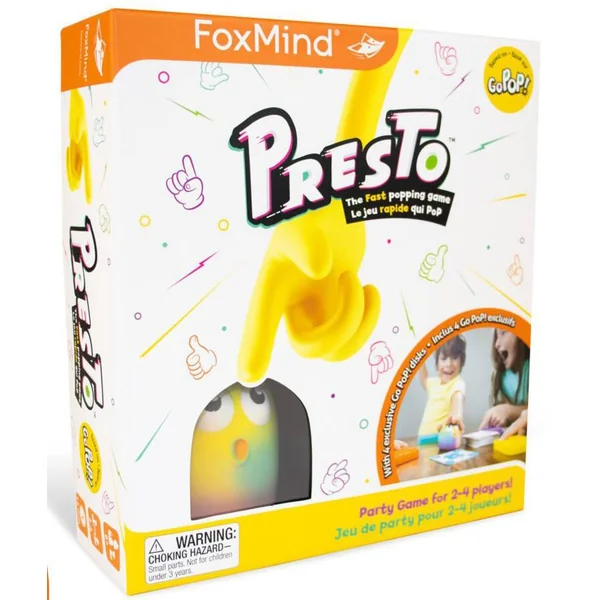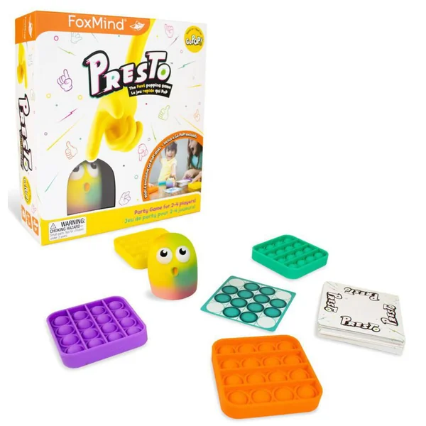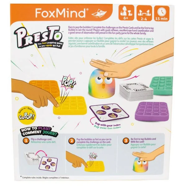 Faites vite pour enfoncer les bulles! Complétez les défis sur les cartes Presto et soyez le premier joueur à appuyer sur Bubblo pour gagner la ronde! Les joueurs avec des réflexes aiguisés, une bonne coordination et un sens de l’observation développé l’emporteront dans ce jeu d’ambiance pour toute la famille. Nombre de joueurs : 2 à 4. Durée de la partie 15 minutes.