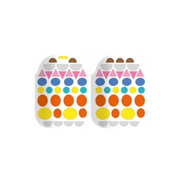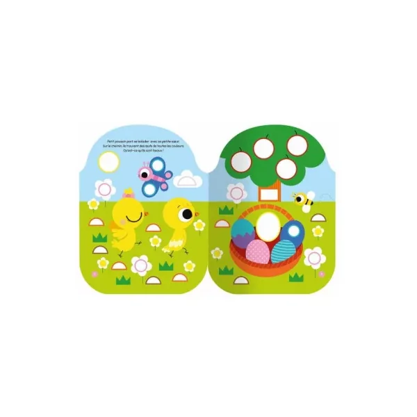 Un cahier de plus de 300 gommettes de formes géométriques, qui servent à compléter l’histoire de petit poussin, à travers un cahier de décors détachable.
