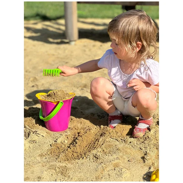 The set includes a charming flower bucket, a matching sieve, a shovel, a rake, and two adorable sand molds shaped like a sun and a beetle. Each component is thoughtfully designed to encourage children to explore their surroundings, dig, rake, and sift through sand, fostering their motor skills and hand-eye coordination. The versatility of this set allows children to build sandcastles, create intricate designs, or simply enjoy the tactile experience of playing with sand.