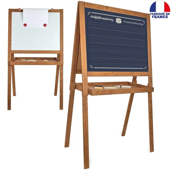 Un grand tableau en bois sur pied avec une face pour écrire à la craie sur les lignes et une autre face blanche magnétique pour feutres et aimants. Ce tableau est doté également d’un rouleau de papier pour dessiner. Livré avec rouleau de papier, magnets, brosse à tableau, craies et feutres.