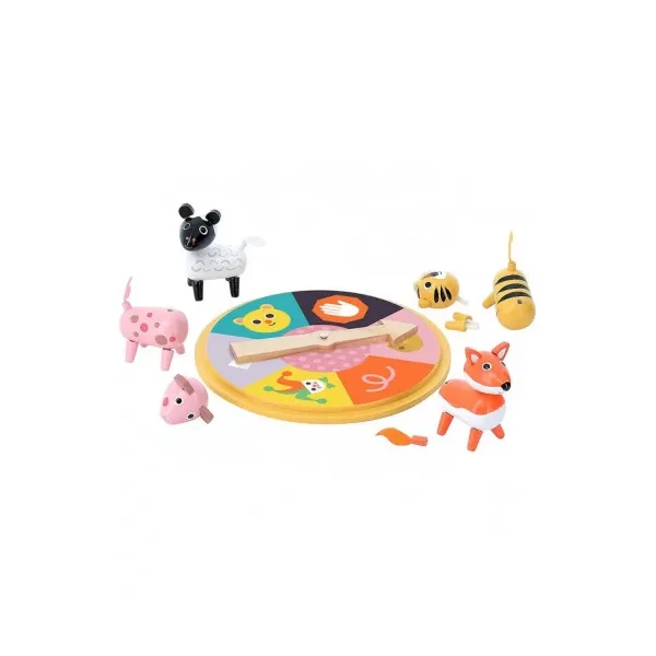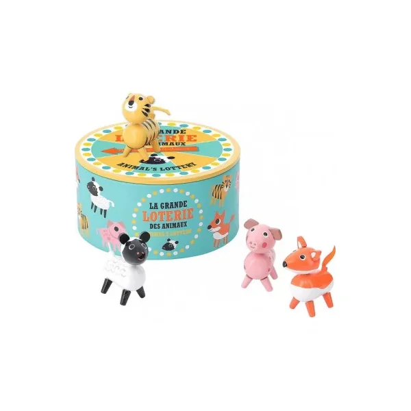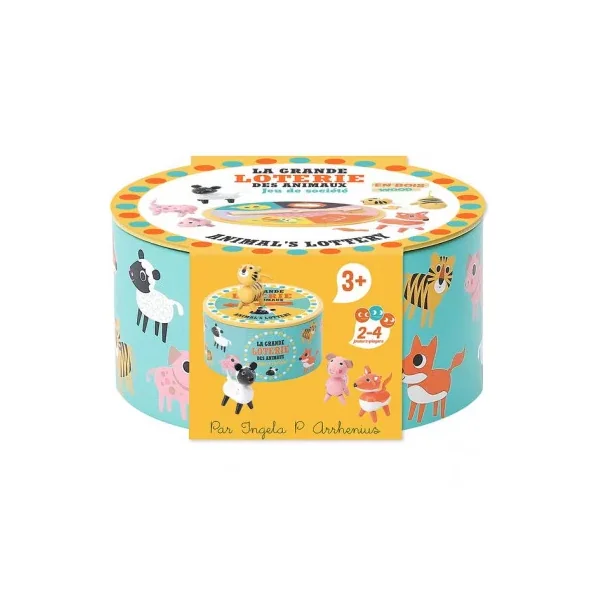 Découvrez le jeu La grande loterie des vaches de Vilac illustré par Ingela P. Arrhenius, un jeu de hasard en bois pour les enfants à partir de 3 ans où le but du jeu est de reconstituer son animal en premier parmi un renard, un mouton, un cochon ou un tigre.