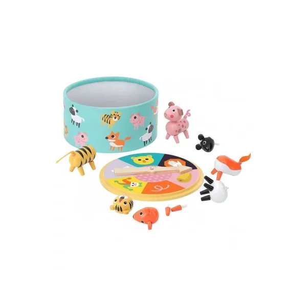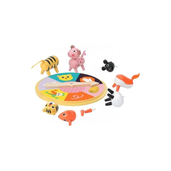 Le jeu comprend un coffret dont le couvercle sert de roulette, 4 animaux composés de 7 parties et la règle du jeu.