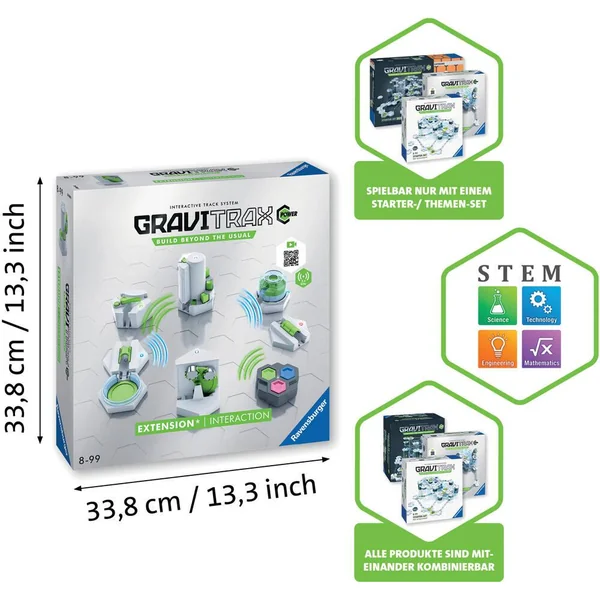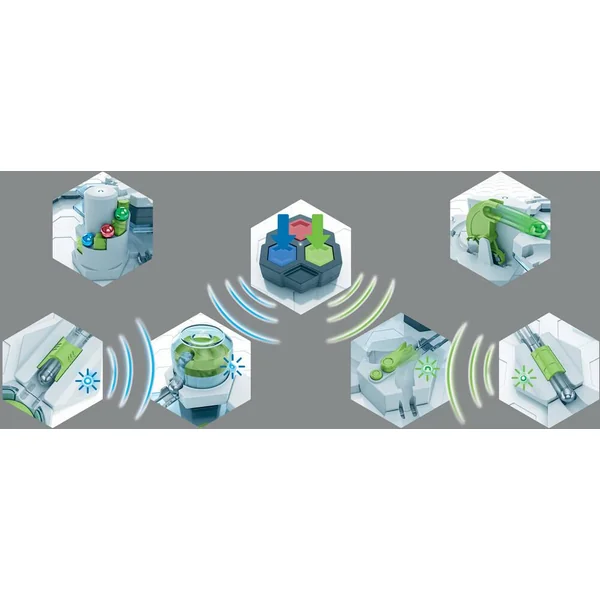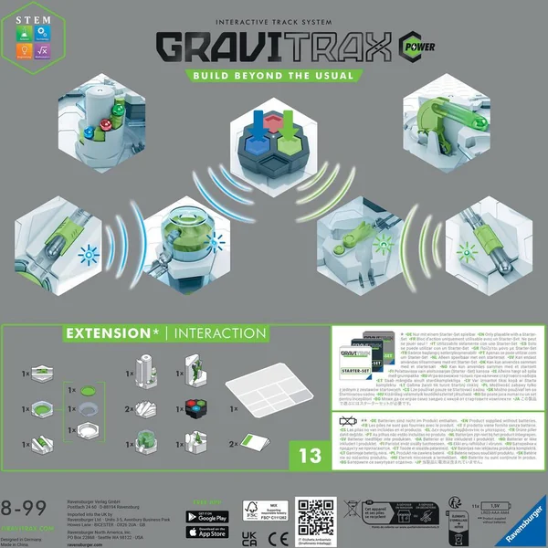 Un set d’extension qui rassemble 7 Éléments GraviTrax POWER ! Retrouve dans ce set d’extension 7 Éléments GraviTrax POWER, qui fonctionnent électroniquement, se remettent seuls en position initiale et communiquent entre eux en s’envoyant des signaux invisibles pour déclencher leur effet. De nouvelles fonctions inédites pour varier les rythmes, multiplier les possibilités, rallonger les temps de parcours et découvrir le mouvement perpétuel. Un premier pas dans la programmation et la connectivité avec GraviTrax POWER ! Contenu : 13 pièces dont 1 télécommande, 1 bloc de départ connecté, 1 tunnel connecté trigger, 1 aiguillage connecté switch, 1 élément connecté Elevator, 1 élément connecté Lever, 1 bloc finisher avec 1 tunnel connecté, 2 tuiles, 2 guides et 1 carnet avec plans de montage.