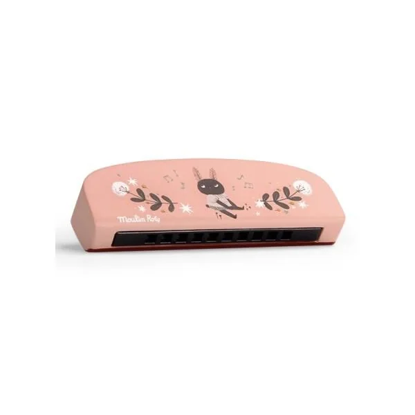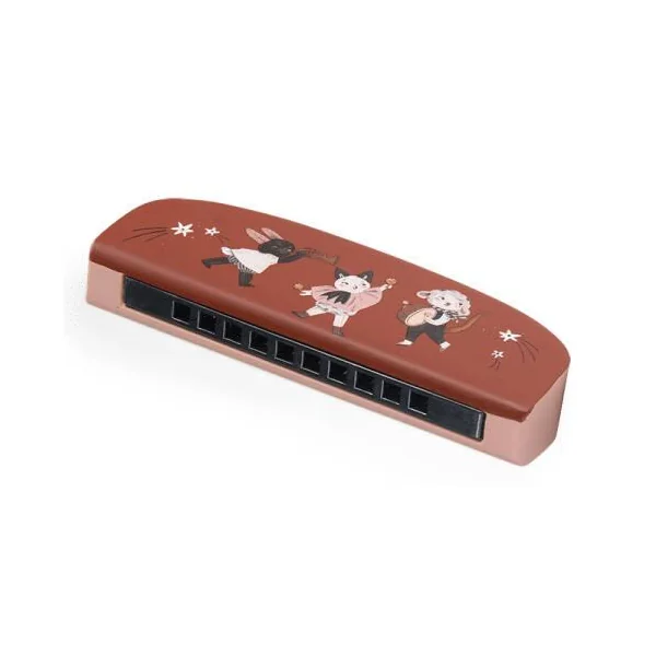 Pour petits musiciens! Harmonica en bois peint pour les premières initiations à la musique, décoré des illustrations poétiques de la collection Après la pluie. Peut-être emmené n’importe où grâce à sa taille de poche. 3 et +
