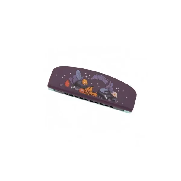 Un harmonica en bois peint : un côté nuit avec les animaux de la jungle au repos, l’autre couleur vert d’eau avec Pakou le toucan et ses amis poussins. Il développera l’éveil musical des tout-petits