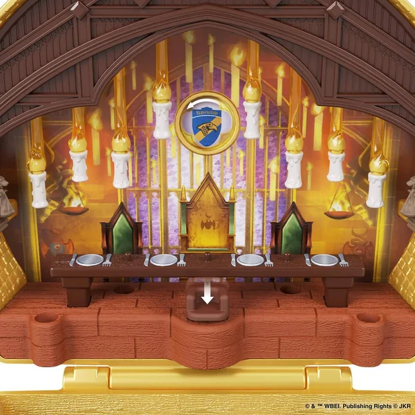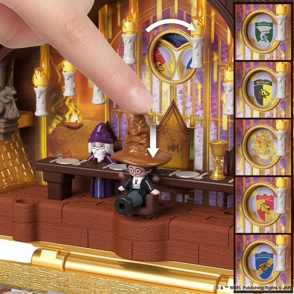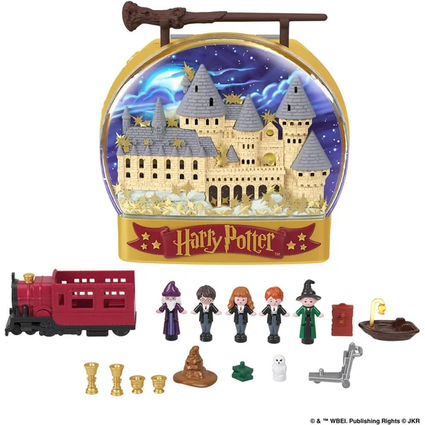 Coffret reproduisant les lieux et scènes cultes du film Harry Potter à l’école des sorciers : la plateforme 9 3/4, le Poudlard Express, l’arrivée en barque au château, la cérémonie du Choixpeau dans la Grande Salle. Inclut 5 figurines et 11 accessoires.