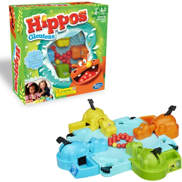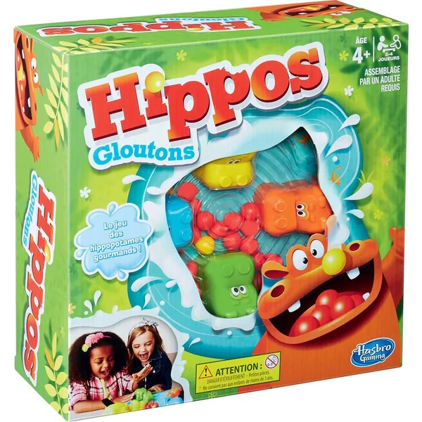 Des heures de plaisir vous attendent avec ce jeu des hippopotames avaleurs de billes. Une fois toutes les billes libérées dans la base du jeu, les Hippos gloutons seront prêts à manger les billes. Il faudra être rapide, car l’hippopotame qui mangera le plus de billes sera déclaré gagnant ! Hippos gloutons et tous les personnages associés sont des marques de commerce de Hasbro. Hippos Gloutons c’est un jeu d’ambiance où ton Hippo Glouton doit engloutir un maximum de billes en un minimum de temps pour être le meilleur de tous les hippopotames ! 2 modes de jeu. Inclut une base de jeu, 4 têtes d’hippopotame, 4 corps d’hippopotame, 20 billes en plastique, un couvercle et les règles du jeu. De 2 à 4 joueurs. Durée de la partie 20 minutes.