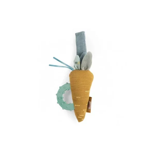 Découvrez le hochet anneau bois poire de la collection Trois Petits Lapins de Moulin Roty, un jouet d’éveil à suspendre aux couleurs du jardin potager.