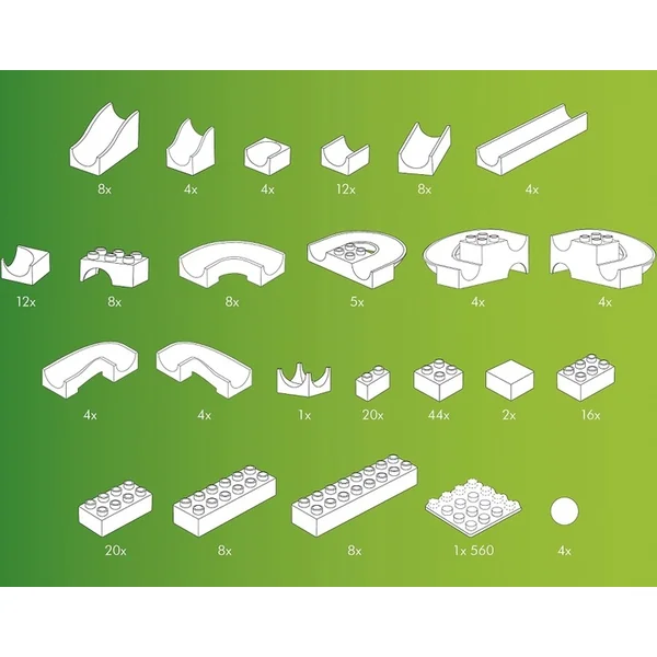 L’ensemble contient 213 pièces de construction, y compris 1 grande base de construction de 32 x 45 cm et 4 billes.