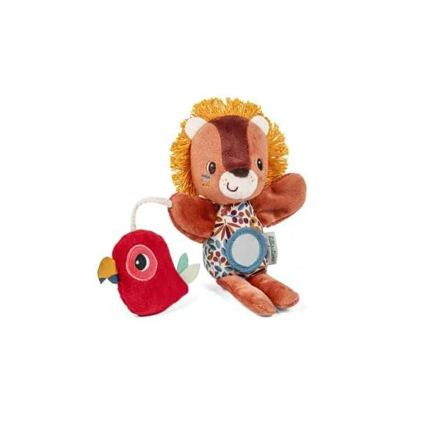 Jack propose 3 activités pour divertir et stimuler les sens de votre bébé : un hochet situé au niveau de la tête, un miroir sur son ventre et son compagnon Gilles le perroquet qui crépite grâce à du papier bruissant.