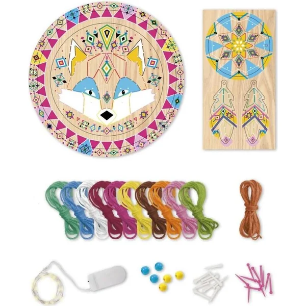 2 plaques avec des formes en mousse prédécoupées, 300 clous en plastique, 10 pelotes de fil de coton de 10 couleurs différentes (7 mètres), 1 corde en jute (3 mètres), 6 perles et 1 guirlande lumineuse avec des piles. Un livret avec un modèle et des instructions est également inclus, guidant les plus petits à travers l’activité étape par étape.