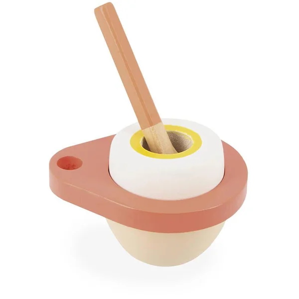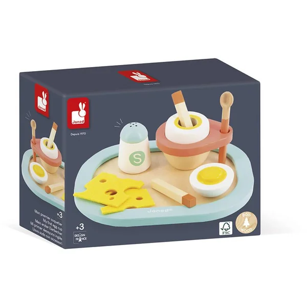 À table ! Au menu le chef vous propose son œuf à la coque et ses garnitures servis sur un plateau en bois. Le coquetier et son œuf sont accompagnés d’une petite cuillère, deux mouillettes, deux tranches de fromage et une salière. Idéal pour développer l’échange et le partage. Jouet d’imitation en bois FSCTM et peinture à l’eau.