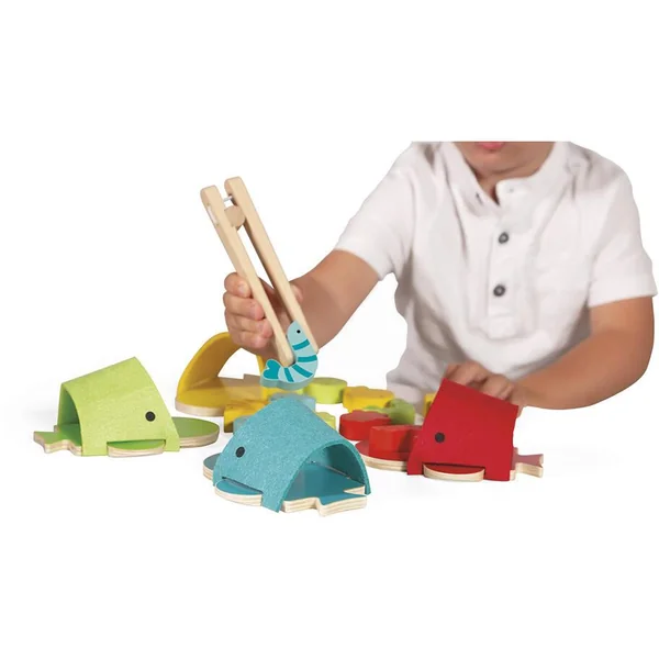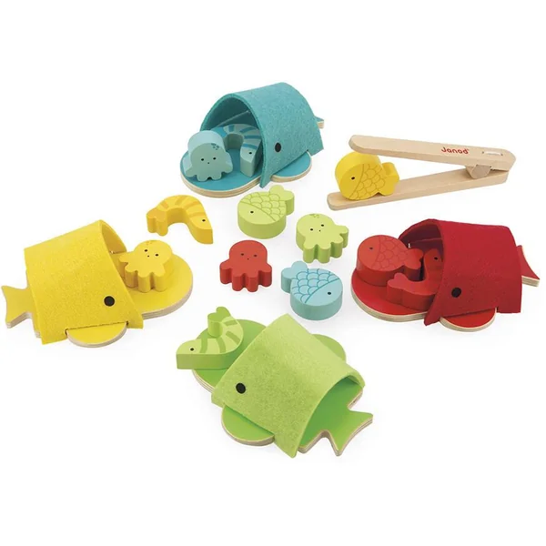 Bleu, jaune ou encore rouge ! Il y a tant de couleurs à découvrir. A l’aide de la pince en bois, votre enfant devra associer les animaux marins et les baleines de la même couleur. Un jeu ludique et pédagogique qui permettra à l’enfant de se familiariser avec les formes et les couleurs tout en développant sa motricité fine. Jouet en bois FSCTM.